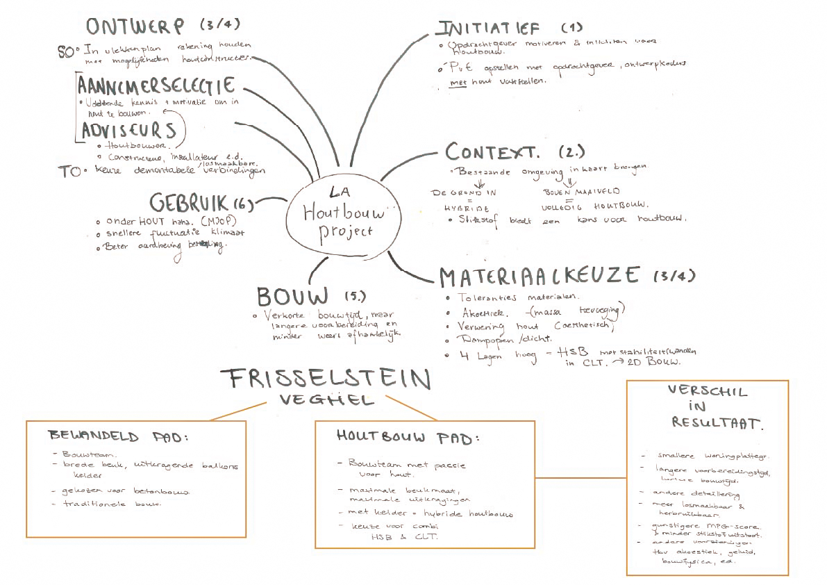 Als verdiepende oefening onderzochten we hoe een bestaand appartementengebouw in Veghel eruit zou zien als houtbouwproject. Met een mindmap brachten we per fase – van initiatief tot gebruik – de verschillen tussen het traditionele pad en het houtbouwpad in beeld. Dit maakte concreet waar houtbouw andere keuzes vraagt en welke impact dat heeft op ontwerp, proces en eindresultaat.