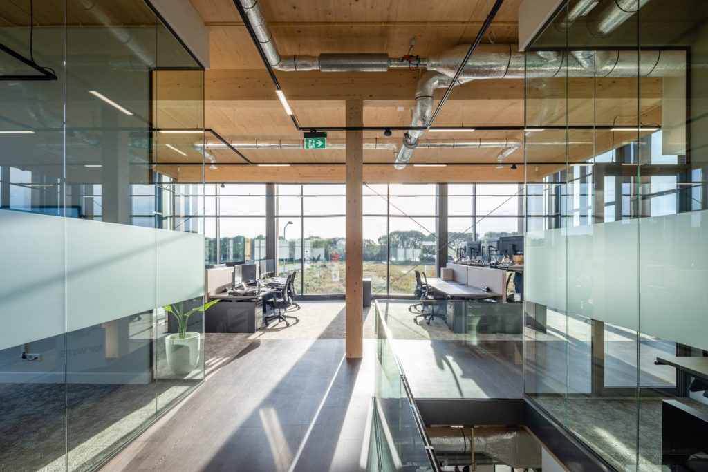 Blikvanger is het tweelaagse houten kantoorgedeelte, prachtig gelegen aan de natuurzone die het terrein scheidt van de kern Empel. Dit is ons tweede kantoorontwerp met een volledig houten draagconstructie.