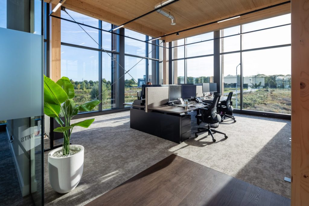 In het transparante, open ontwerp zijn afstanden en communicatielijnen zo kort mogelijk gehouden, komt daglicht in overvloed binnen op alle werkplekken (dus ook in de hal en het magazijn) en is volop rekening gehouden met de verwachte groei van het bedrijf.