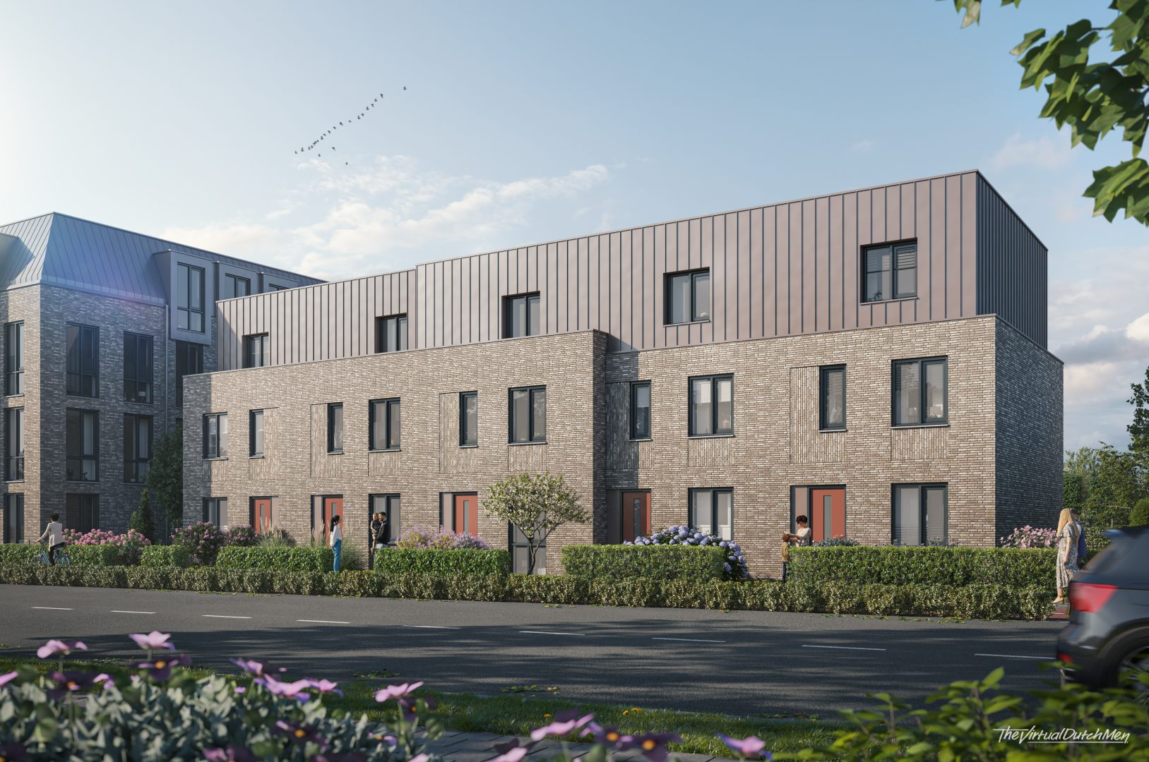 De architectuur kenmerkt zich door een ingetogen en aardse uitstraling, met rijke bakstenen gevels en verfijnde detaillering. Verticale gevelopeningen vormen een doorlopend ritme, terwijl ambachtelijk metselwerk en subtiele kleuraccenten zorgen voor samenhang en warmte. Zo ontstaat een eigentijds geheel dat stevig verankerd is in zijn omgeving.