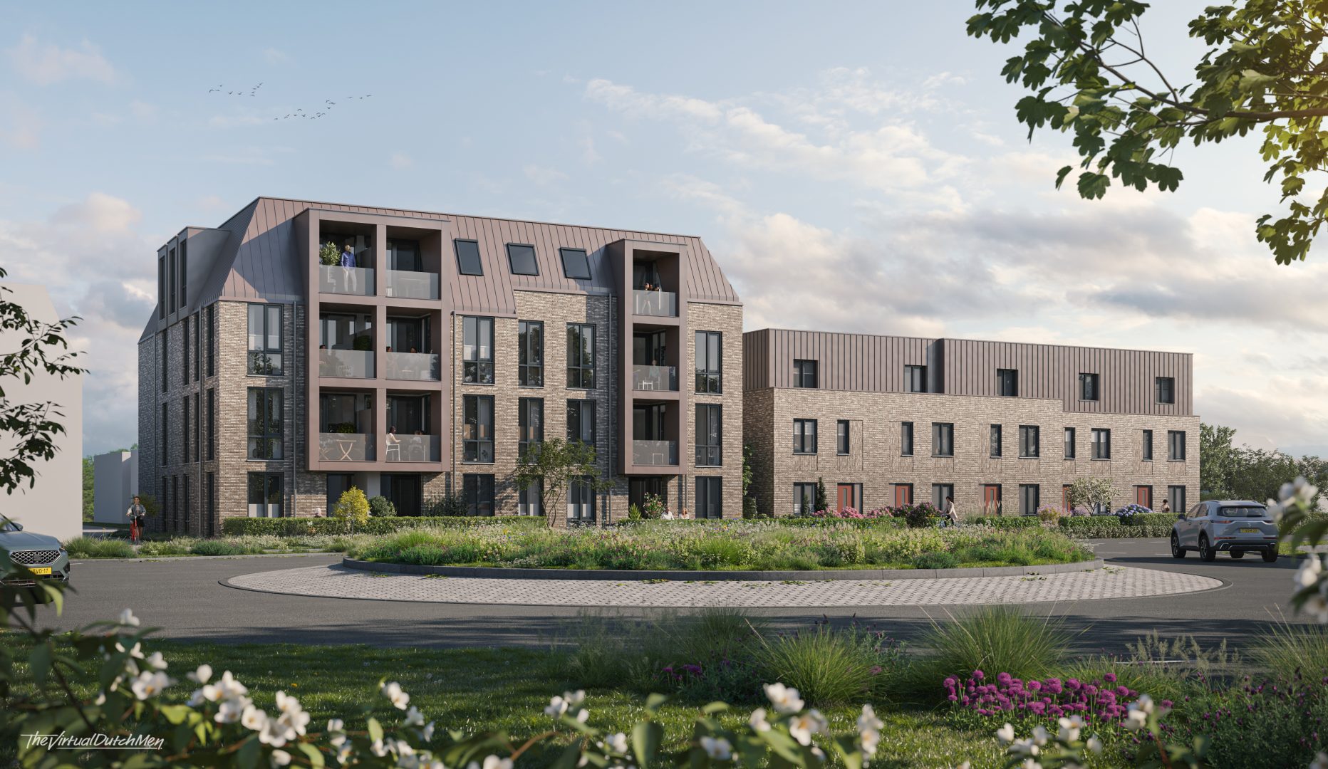 Het appartementengebouw is opgebouwd uit twee samenhangende volumes, waarbij het deel aan de rotonde zich nadrukkelijk presenteert met een verticaal element dat de drie bouwlagen en het dak met elkaar verbindt. De naastgelegen woningen sluiten hier in vormentaal op aan, maar zijn kleinschaliger van opzet.